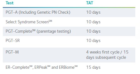 Our turnaround time for PGT-A is 10 days from sample receipt. CooperSurgical does not offer expedited testing for fresh transfers.