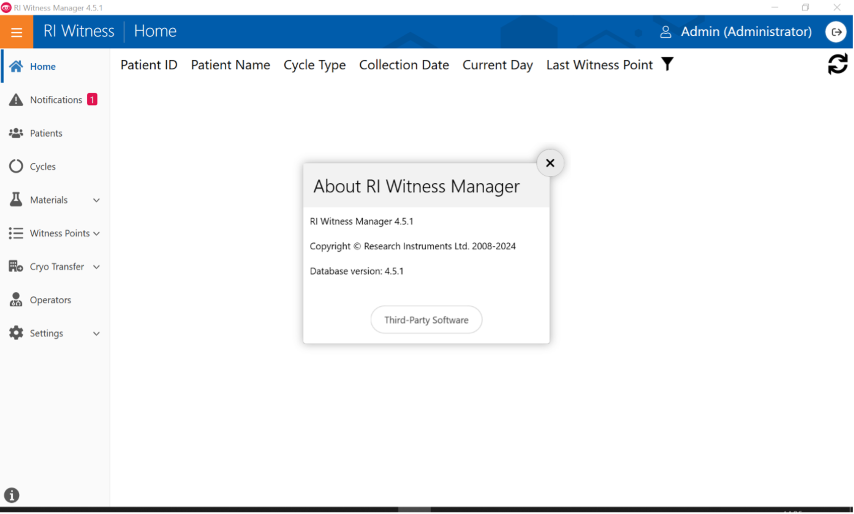 left of the RI Witness Manager screen which opens the About RI Witness Manager box.